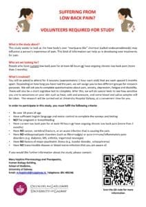 The findings from this study will advance the understanding of how low back pain develops in people, and whether endocannabinoids may play a role. The study, which has full ethics approval from the University of Galway and University Hospital Galway, aims to pave the way for developing novel endocannabinoid-based diagnostic biomarkers and therapeutics for chronic low back pain. The research is being conducted at the Clinical Research Facility in University Hospital Galway. For more information or to register your interest in participating in the research study, please scan QR code below contact Mary Hopkins at m.hopkins9@universityofgalway.ie